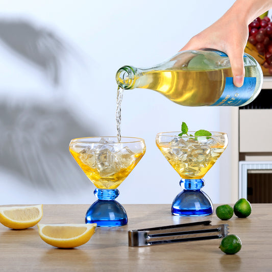 NUTRIUPS 7oz Hand-made Stemless Martini Glasses, Color-block Solid Glass Base Heavy-duty Cocktail Glasses, Aroma-Locking Rim Glasses for Home Bar Party Gifts (Sunshine & Sky Duo)
